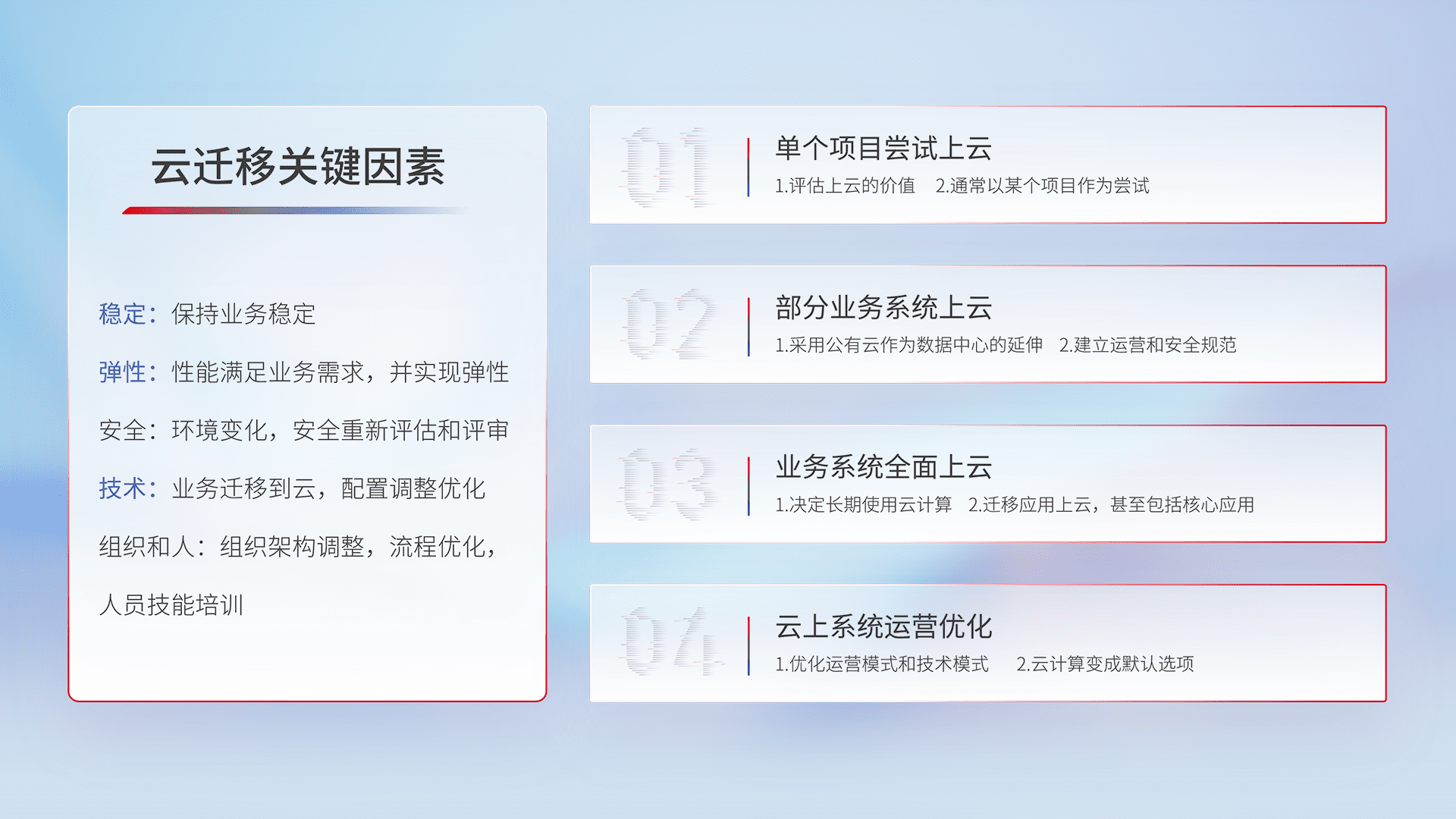 结合实际业务,,,从规划设计、、、云平台选型、、、云原生改造、、、数据迁移、、集成交付,,,,迁移全过程为客户识别最佳上云路径,,做好风险识别管理,,,,设计网络架构、、、、身份权限、、、、安全审计合规、、操作审计、、、、日志审计、、、监控告警策略、、多站点容灾设计等,,对云上基础设施进行整体规划,,,提升IT治理水平,,,,以满足弹性、、、、高可用、、、高性能的需求。。。