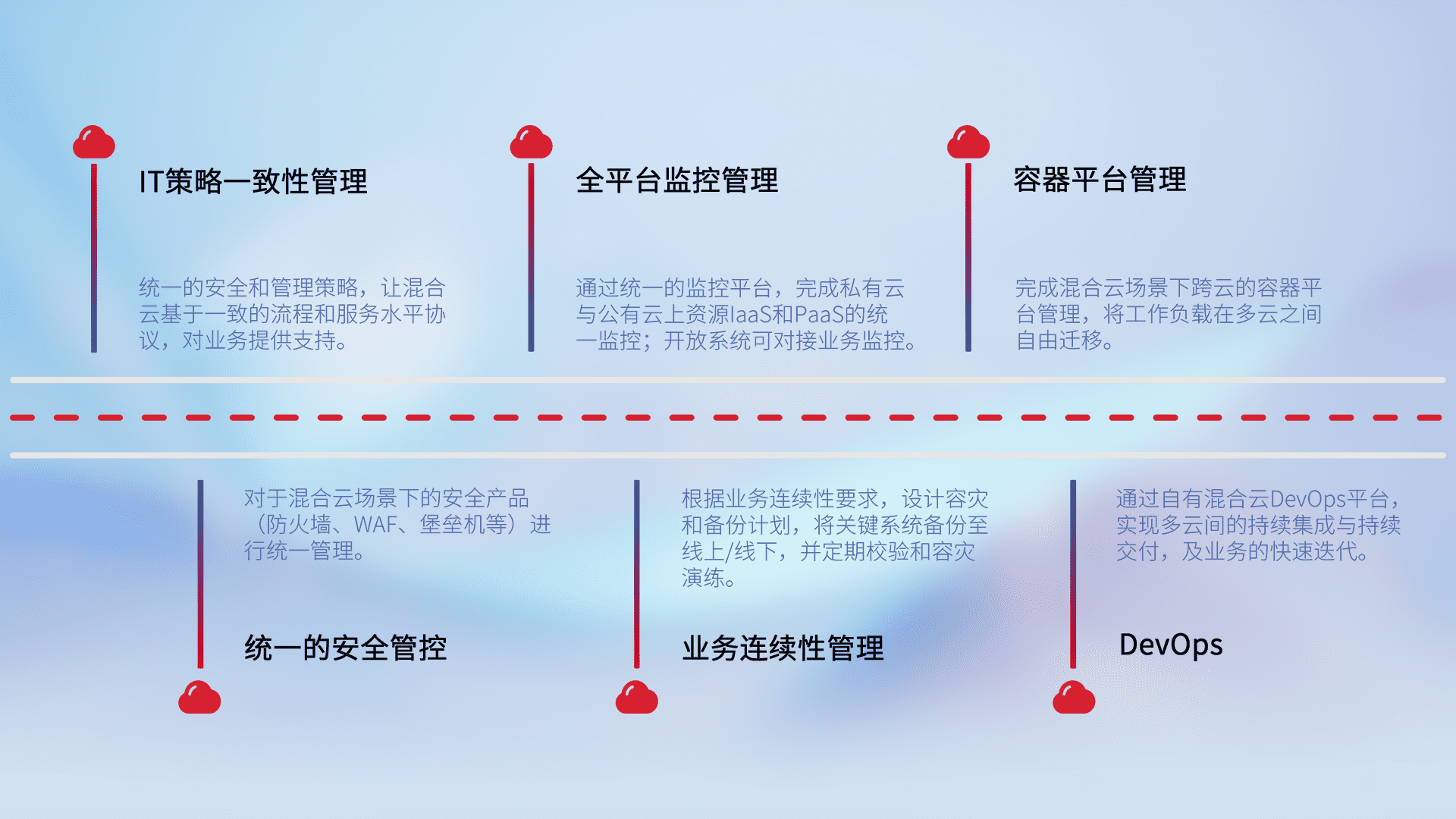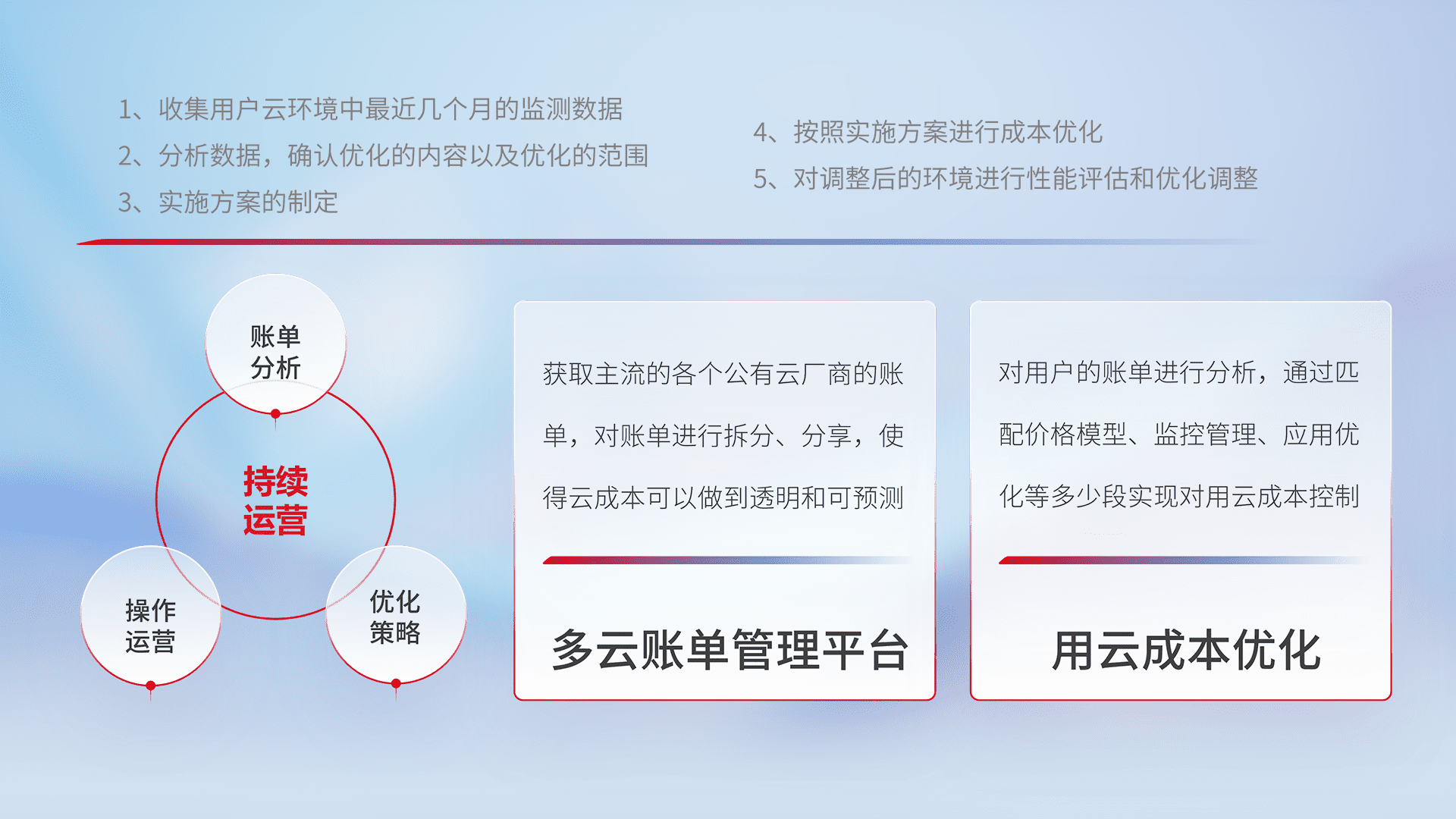 通过多云纳管,,,以统一的资源数据模型把客户的云资源进行抽象和封装,,进而实现对多云资源的统一操作,,保障云资源管理的可靠性、、、、稳定性与可用性。。。。量身定制化运维内容,,,配置、、、、开发运维、、、补丁管理、、备份、、、、监控、、、、认证和访问管理、、审计和日常巡检等,,,,保障在用云过程中的可靠度,,,,稳定度以及高可用率。。