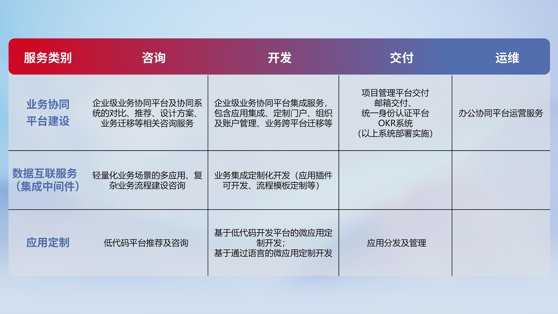 针对钉钉、、、、企微、、、IDaas等平台级产品提供产品的规划、、、方案、、、交付、、定制化开发等服务,,,实现如统一协同办公、、智能客户服务、、、混合会议管理、、、智能数据查询、、、等业务场景,,实现数字化转型。。。